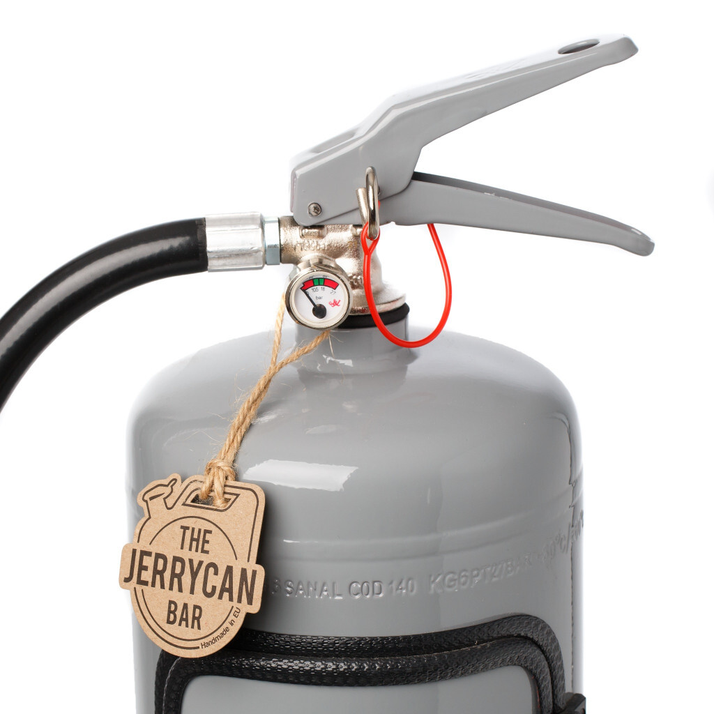 Gray The Firebar mini bar is a handcrafted cabinet built into a real fire extinguisher shell, hiding a stylish surprise inside: two 30 ml Casablanca glasses, a decorative hose with magnetic holder, LED touch lamp, and wall mount bracket.